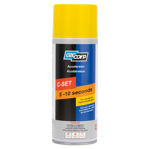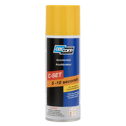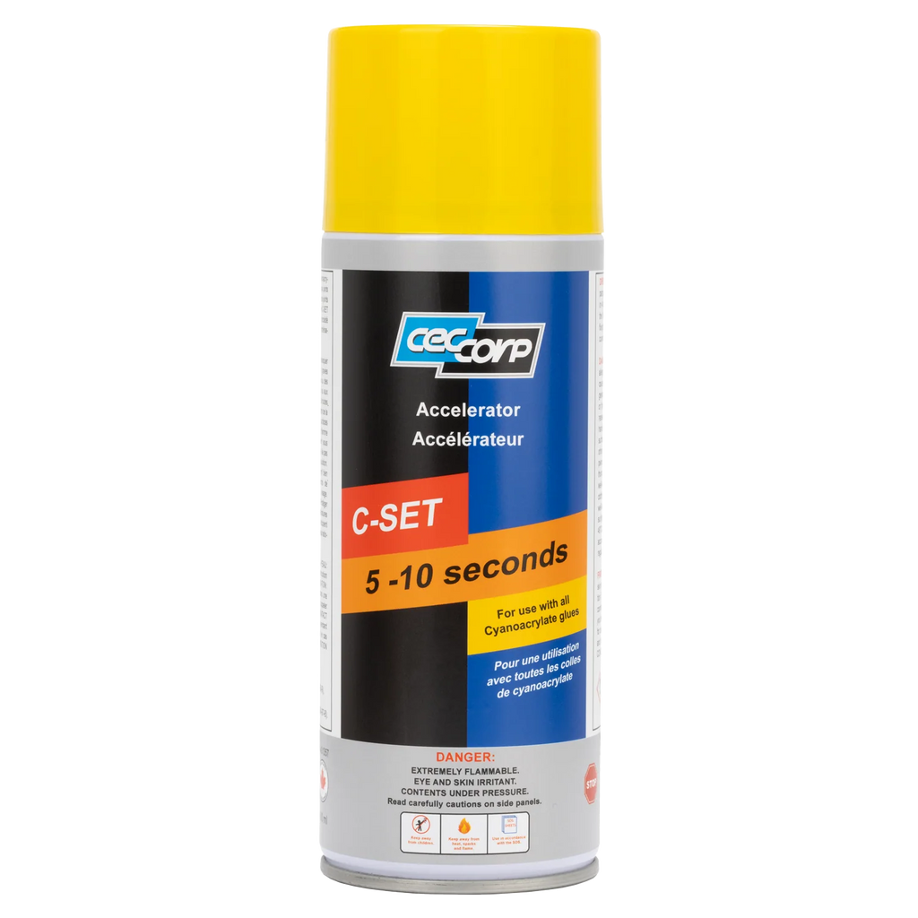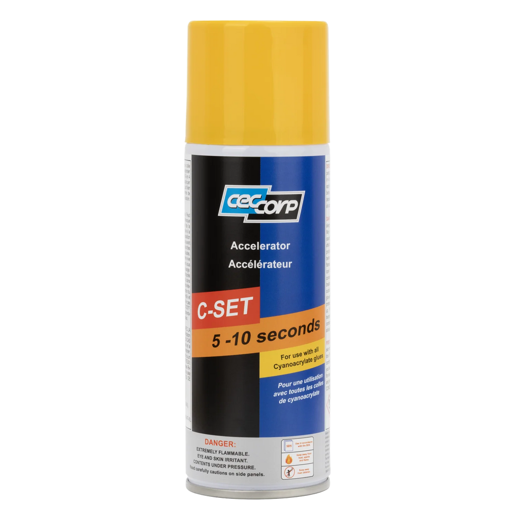 C-Set is a Super Glue Accelerator, also known as a glue “activator.” It is used to speed up the drying time of cyanoacrylate super glues. The accelerator is a solvent-based product that can be applied before and/or after the glue application. C-Set Accelerator is commonly paired with high viscosity glues, as thicker viscosity glues take longer to dry. It is also useful when priming uneven surfaces or material combinations that are harder to bond, and in colder, drier environments where curing time may be delayed.
