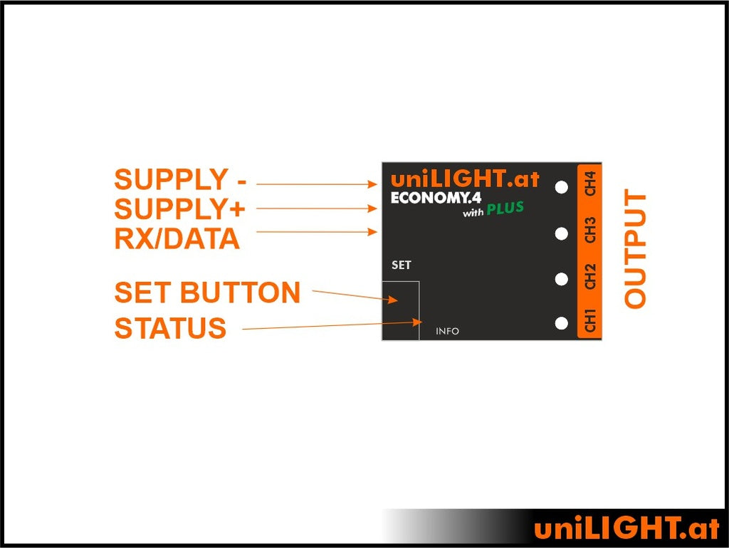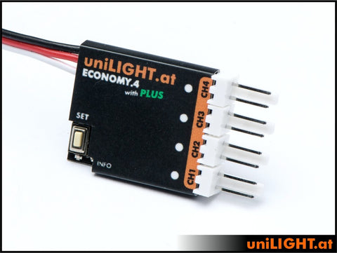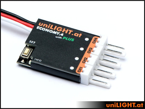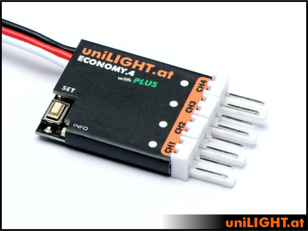 The ECONOMY.4 is the simplified version of the BLACK.4 controller. It has been reduced in certain features to provide a simple and cost-effective lighting system for smaller and medium-sized models. It is significantly smaller and lighter, limited to lower power outputs and lacks certain protective features to keep costs down. However, it still offers four control functions: