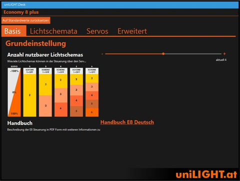 The software interface has been upgraded to the 3-pin data interface for the uniLIGHT MODUL-PLUS programming cable. In addition to providing more stable communication, the data connection status can be traced directly on the cable. Other features of the E8 include: