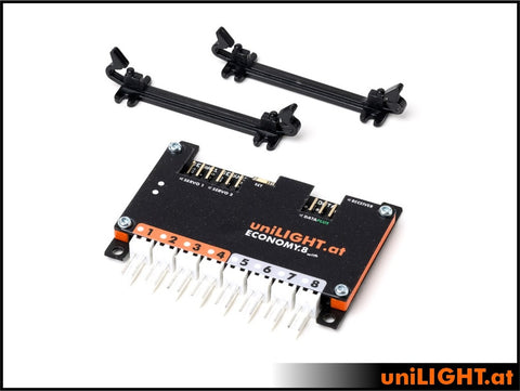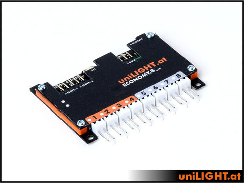 This 8-channel module continues to offer versatile solutions for all lighting tasks in functional model building. It supports up to eight electrical or lighting circuits, with the option to use two different operating voltages. You can select up to six dynamic lighting sequences, five of which are fully programmable. These can be chosen via the servo range from -100% to +100%. Additionally, the speed of the lighting effect can be adjusted to suit personal preferences and the scale of the model.