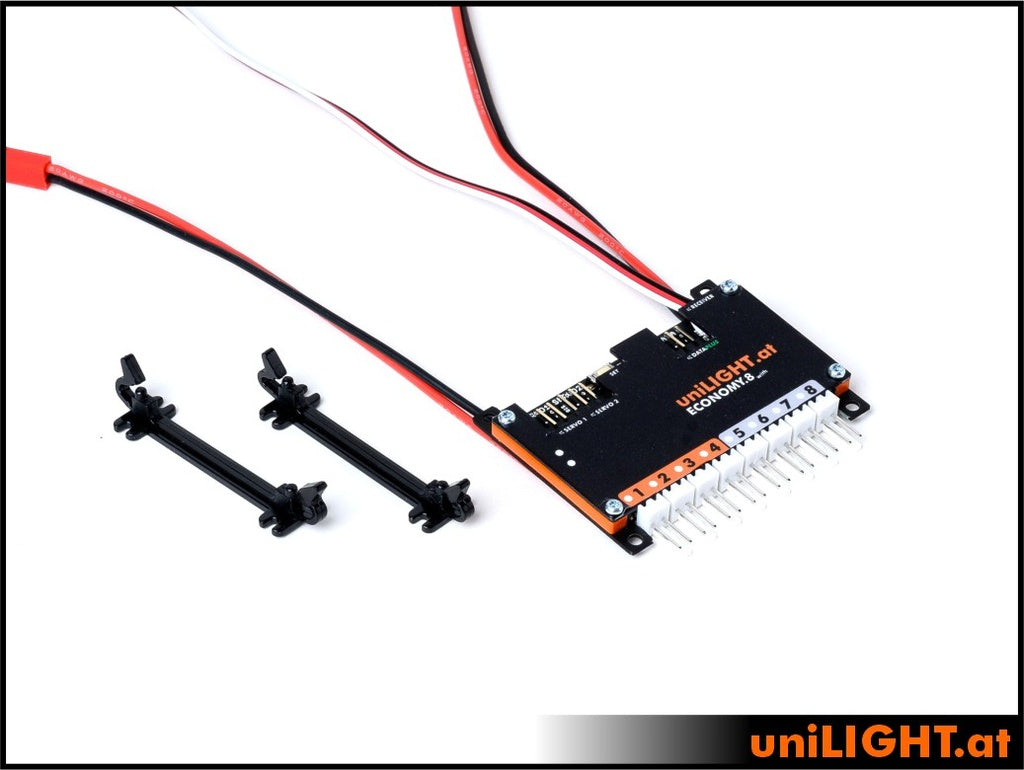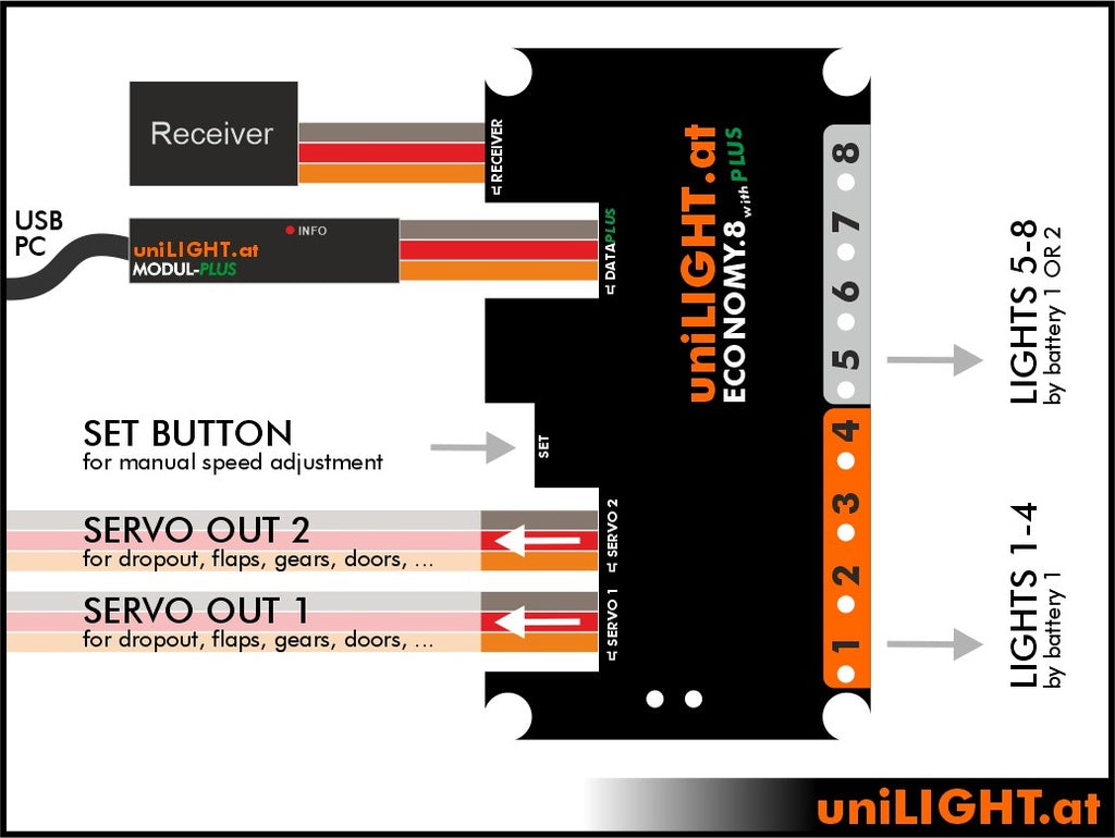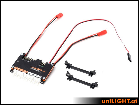 • Two servo outputs for controlling drop-out spotlights, flaps, landing gear, etc.