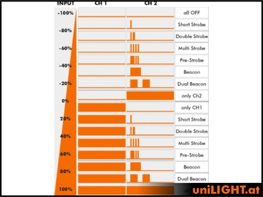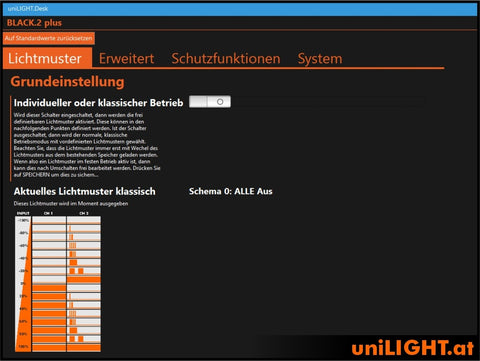 Our 2-channel module Black.2+ is easy to use and delivers quick results for all model applications. In the classic operating mode, fixed light patterns are preprogrammed and can be triggered via the servo signal range as usual. However, using the MODUL-PLUS programming cable and uniLIGHT.DESK, fully customizable light patterns can be configured.